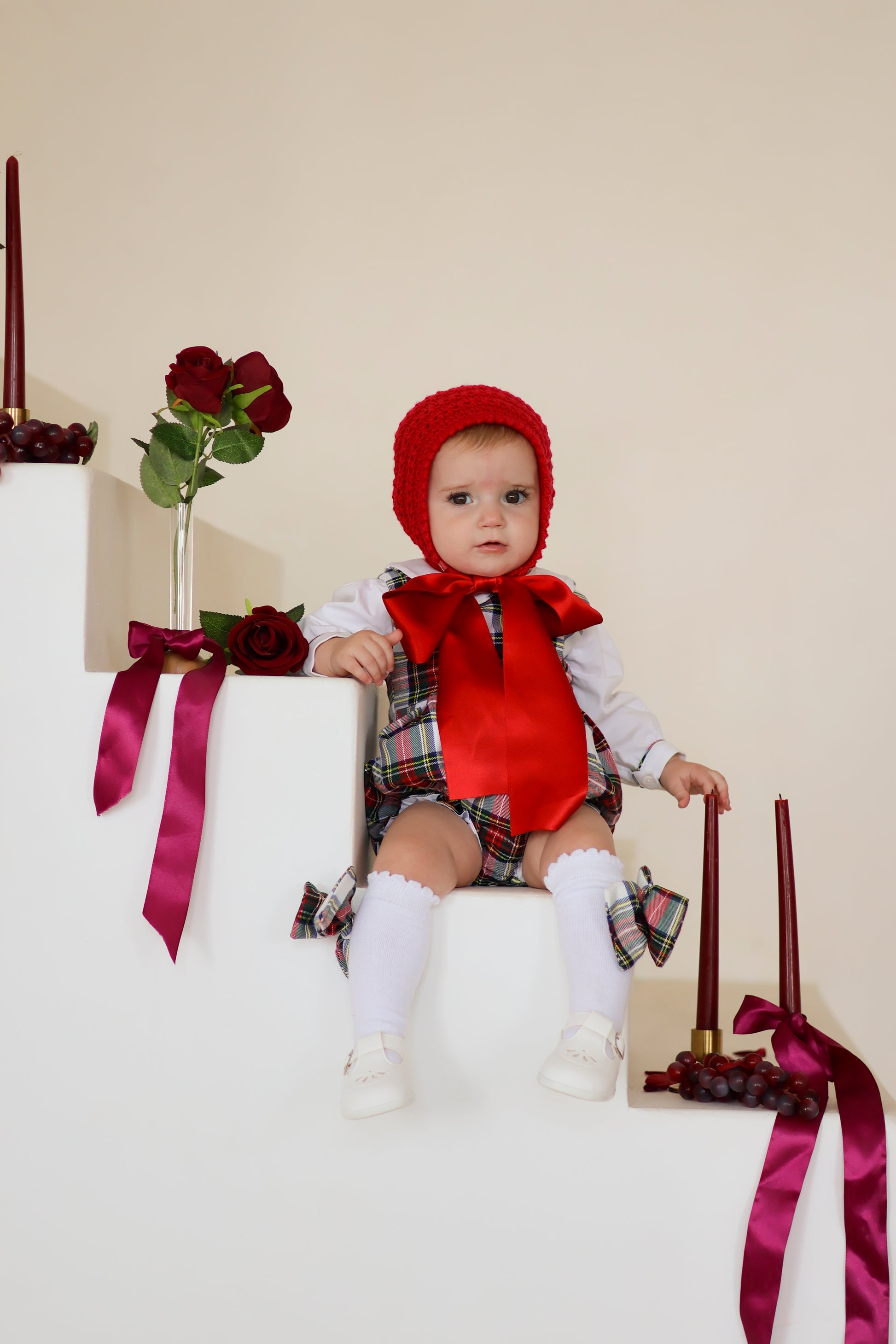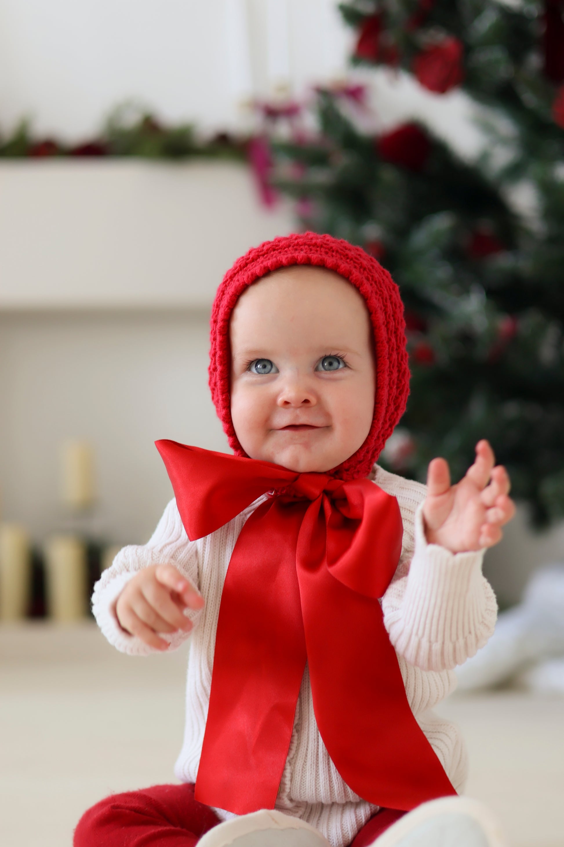 Celebrate the holiday season with this charming vintage Elizabeth-style Christmas bonnet, lovingly hand-knitted from 100% merino wool—soft, sustainable, and gentle on your baby’s delicate skin. Each bonnet is made to order, with a satin ribbon hand-sewn for a classic, festive touch and picot edging for timeless elegance.