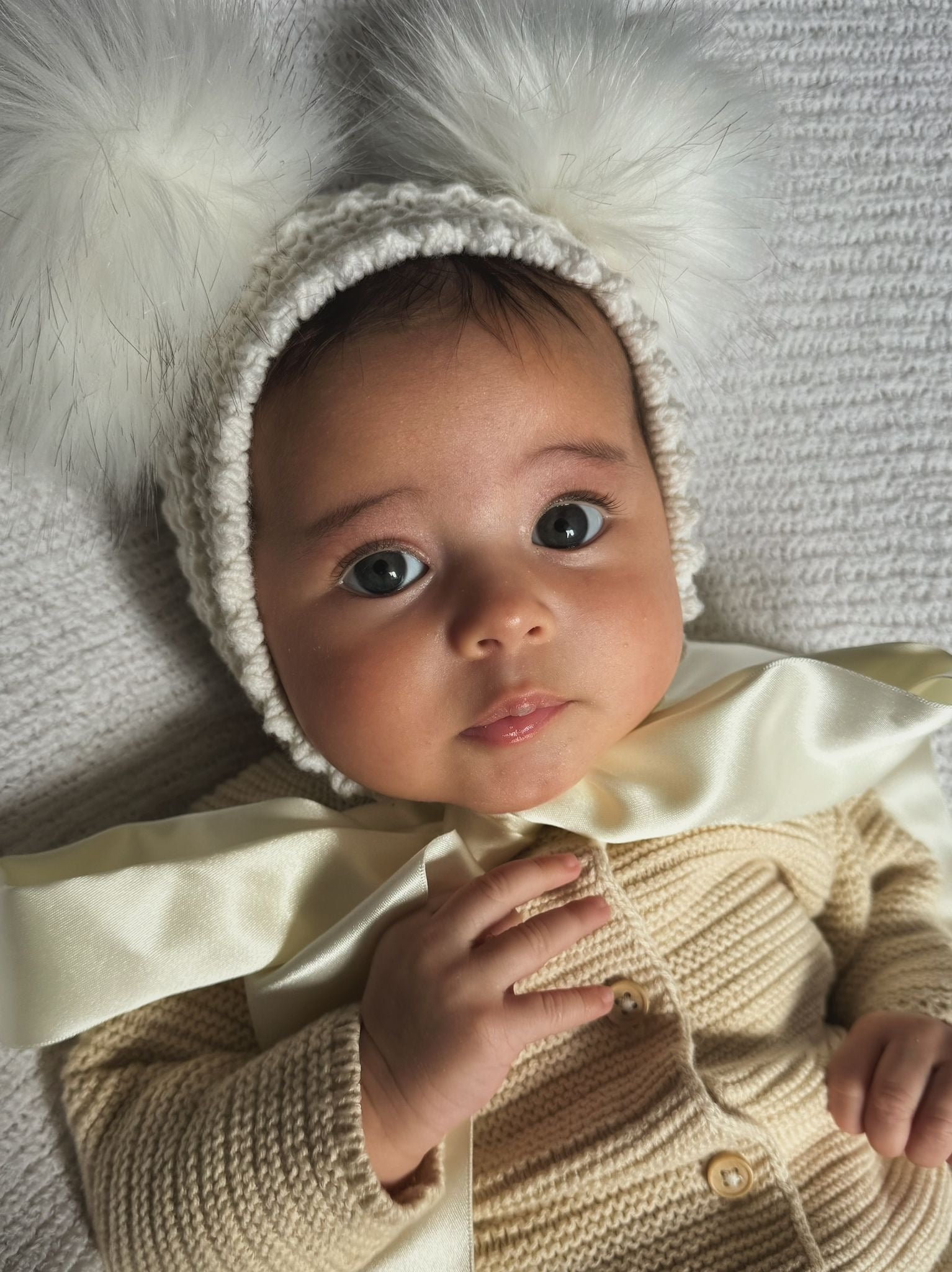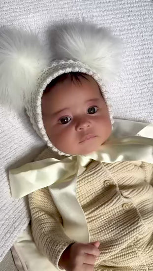 This off white bonnet, features a delicate picot edge and is finished with hand-sewn satin ribbon in bridal white, adding a sweet and timeless touch. It also includes detachable faux fur poms, offering a playful detail with the flexibility to wear the bonnet with or without them.